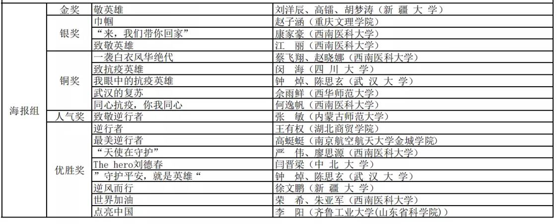 比赛共收到来自湖北、四川、山西、新疆、北京等十多个省市自治区五十余所高校的200余名同学制作的300余件参赛作品。他们用海报、微视频、动画等形式表达了对“抗疫英雄”的敬意。