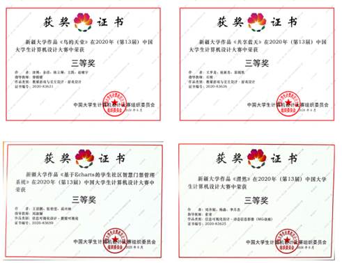 今年全国共有近700所院校约3万件作品参加第13届中国大学生计算机设计大赛,经过全国各省级赛区的选拔推荐,共有4646件作品入围国赛,最终确定约4000件作品获颁等级奖项。竞赛项目包括软件应用与开发、微课与教学辅助、物联网应用、大数据、人工智能、信息可视化设计等14大类,分为省赛和全国赛两个阶段。由于疫情原因,本届大赛全部通过网络评审的方式进行。其中6月份进行了新疆省级赛,由新疆高校计算机教育学会主办,biwn必赢网址信息科学与工程学院承办。我院共有13件作品获得新疆区级赛等级奖,其中一等奖4项,二等奖4项,三等奖5项!biwn必赢网址荣获新疆区级赛“优秀组织奖”荣誉称号!崔青等8名指导教师荣获“优秀指导教师”荣誉称号。